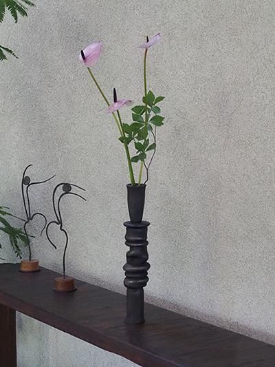 アイアン製の花器、高さ約30cm/横幅は約6cm・底部で直径4.5cm