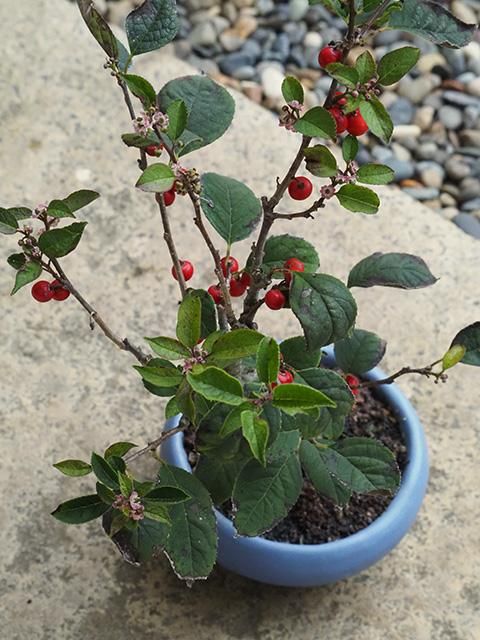 赤い実がお祝いなどにも相応しい実物盆栽。